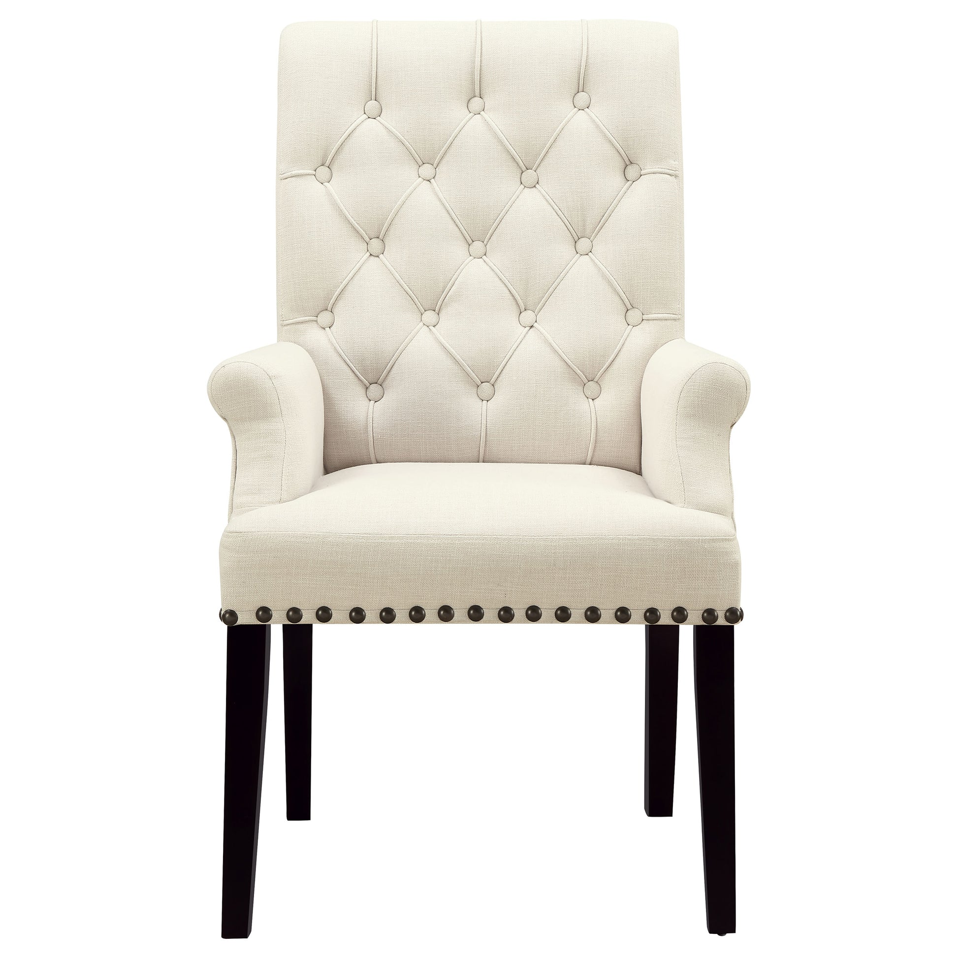 Designed for both luxury and support, this arm chair brings an elegant presence to any dining space. Its button-tufted high back and rolled top lend a timeless aesthetic, while the addition of padded armrests enhances comfort. Hand-applied nailhead trim offers a sophisticated finishing touch, complementing the chair’s tailored silhouette. A generously padded seat and sturdy legs ensure both durability and long-lasting comfort, making it a stunning choice for formal and everyday dining alike.