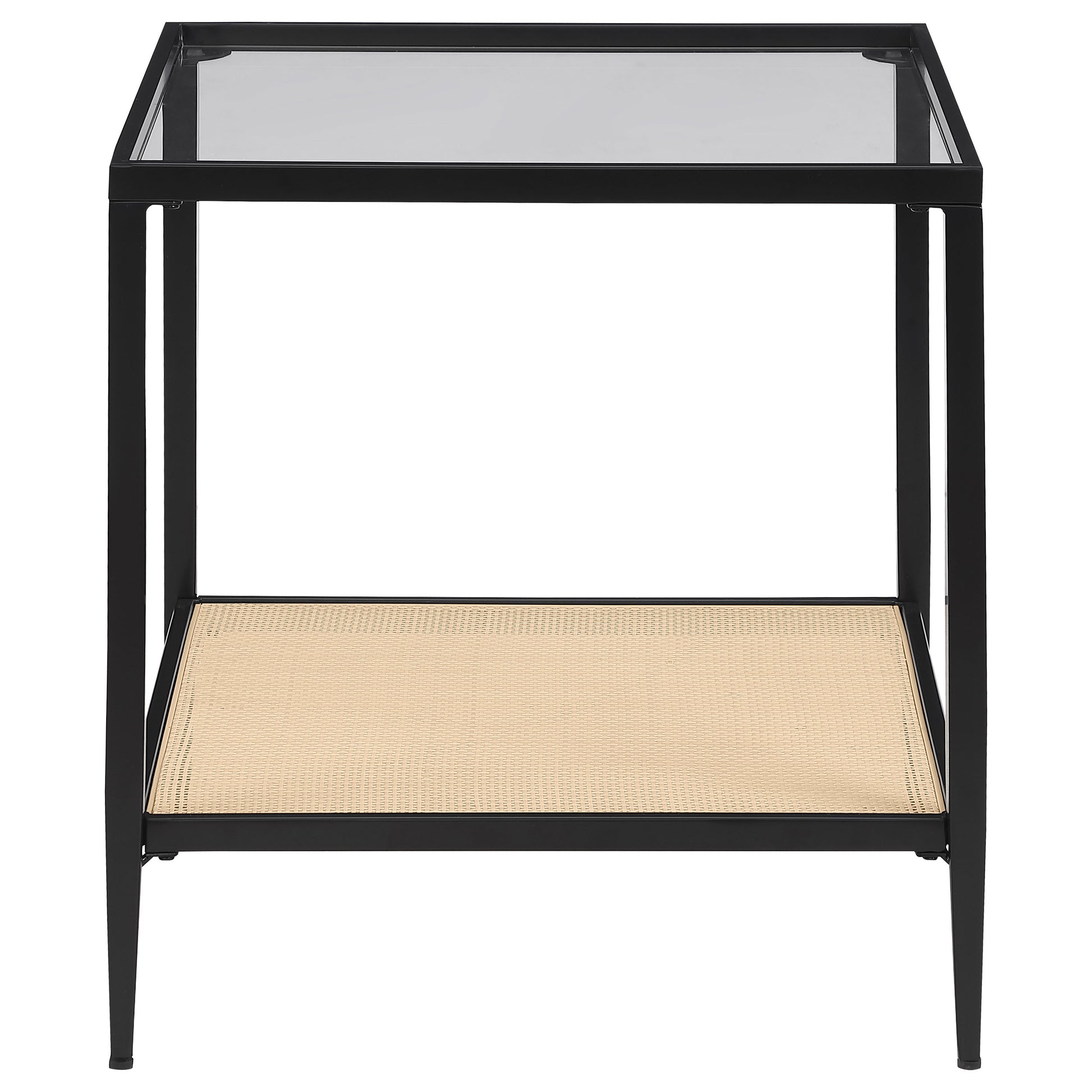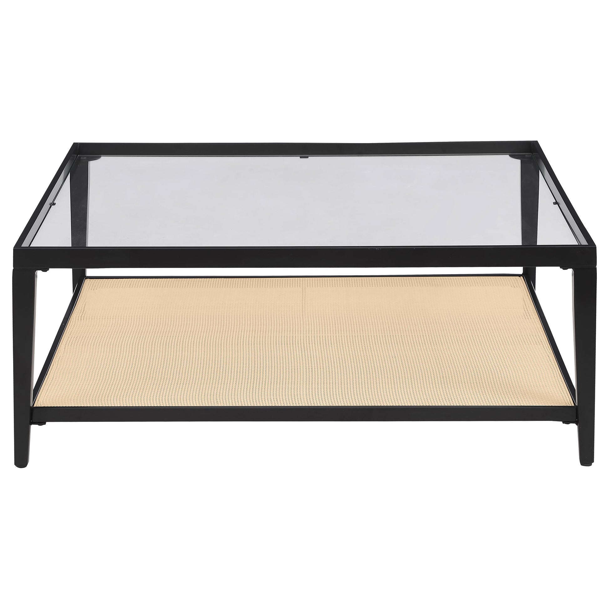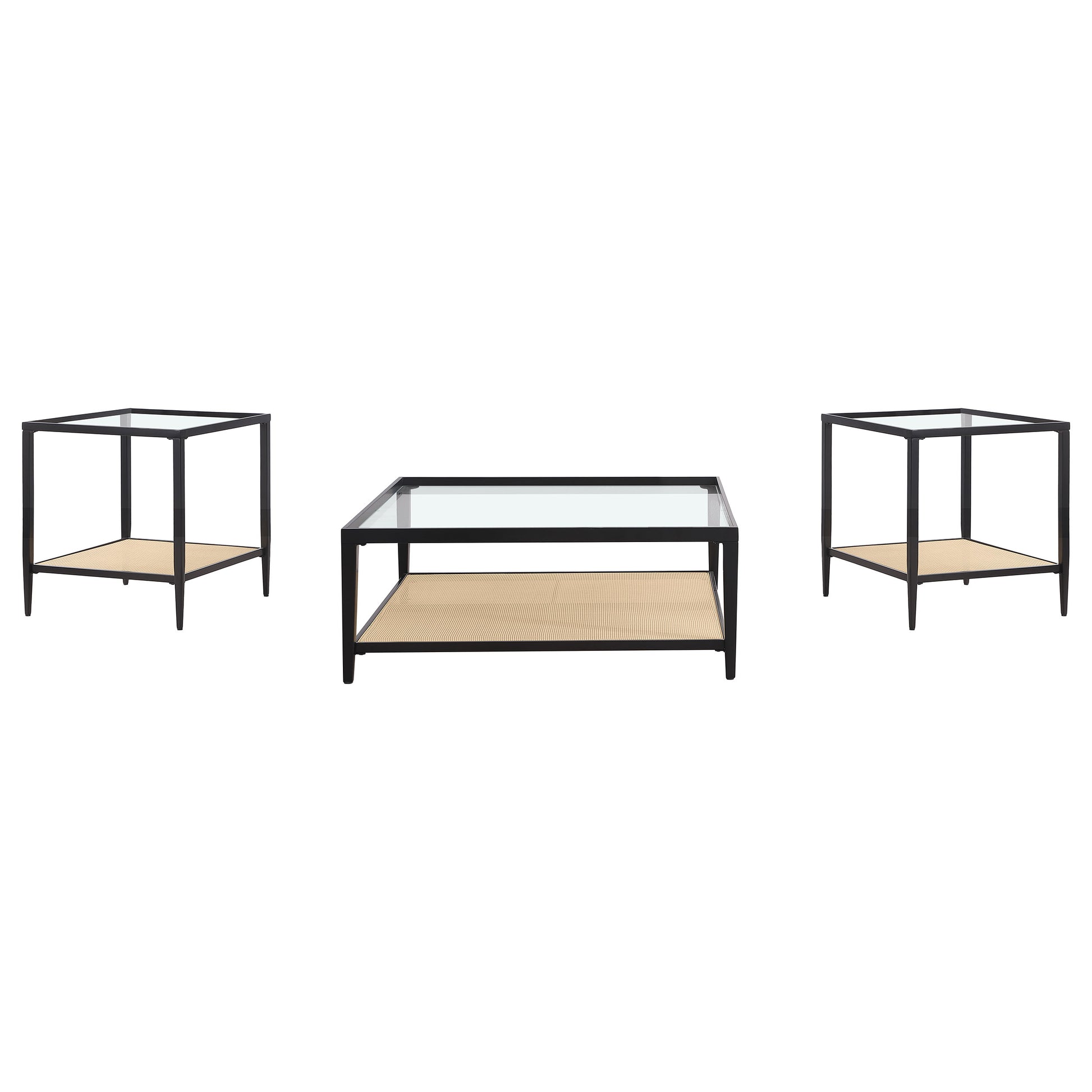 This coffee table set combines modern design with functional versatility for your living room. Featuring black powder-coated metal frames, these tables boast a sleek, minimalist look. Clear tempered glass tops add an elegant and open feel, while woven polyethylene (PE) rattan shelves provide texture and convenient storage options. Perfect as a cohesive occasional table set, this design effortlessly blends natural and contemporary elements to elevate your space with style and practicality.