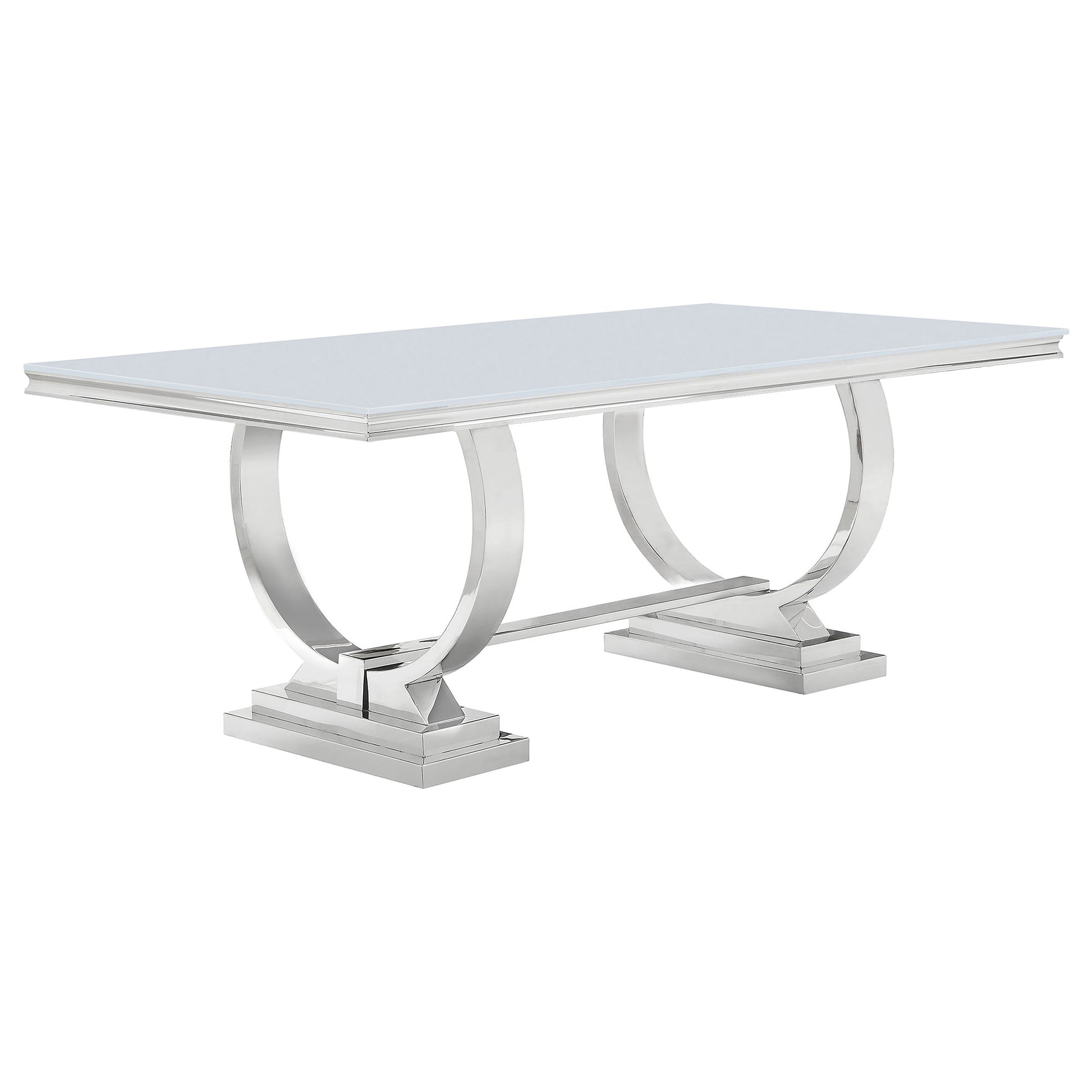 • Indulge in opulence with our 7-piece dining set featuring an expansive opaque white tempered glass table and stainless steel trestle base adorned with chrome-finish ring-shaped end supports