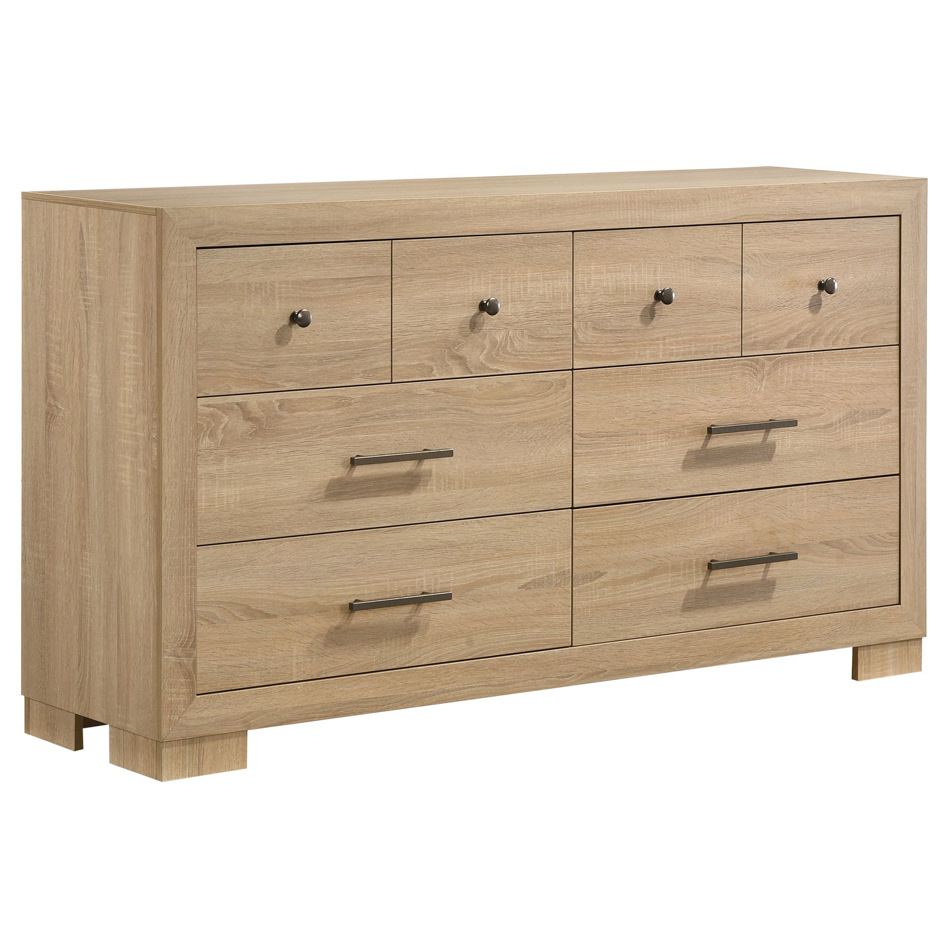 • Six-drawer dresser with modern lines and light oak finish for relaxed sophistication