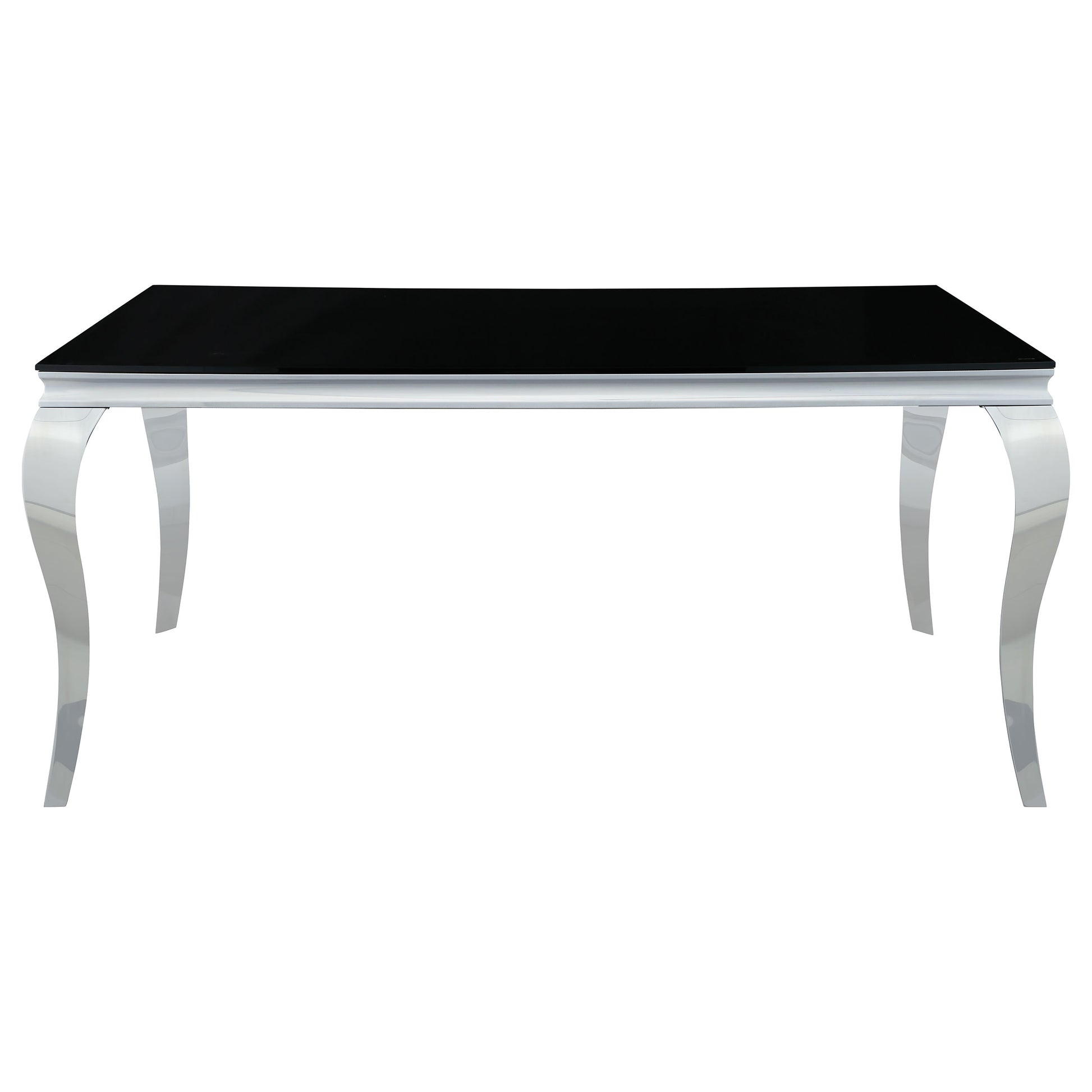 Experience the Carone 5-piece dining set, seamlessly fusing modern design with timeless elements. The table's stainless steel legs bring sophistication, curving artistically and contrasting the 12mm tempered glass top with beveled edges. Hosting formal feasts is effortless on this table. Complementing this, the elegant dining chairs exude sleek sophistication. Their chrome-finished legs, including creatively curved front legs, offer a captivating shine. Luxe velvet upholstery graces the seats, available in various colors to personalize your space. Elevate your dining area with the Carone collection, where innovation meets opulence.
