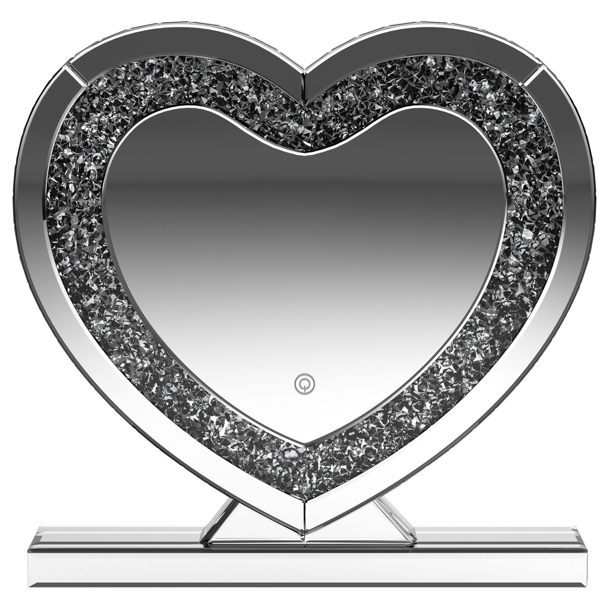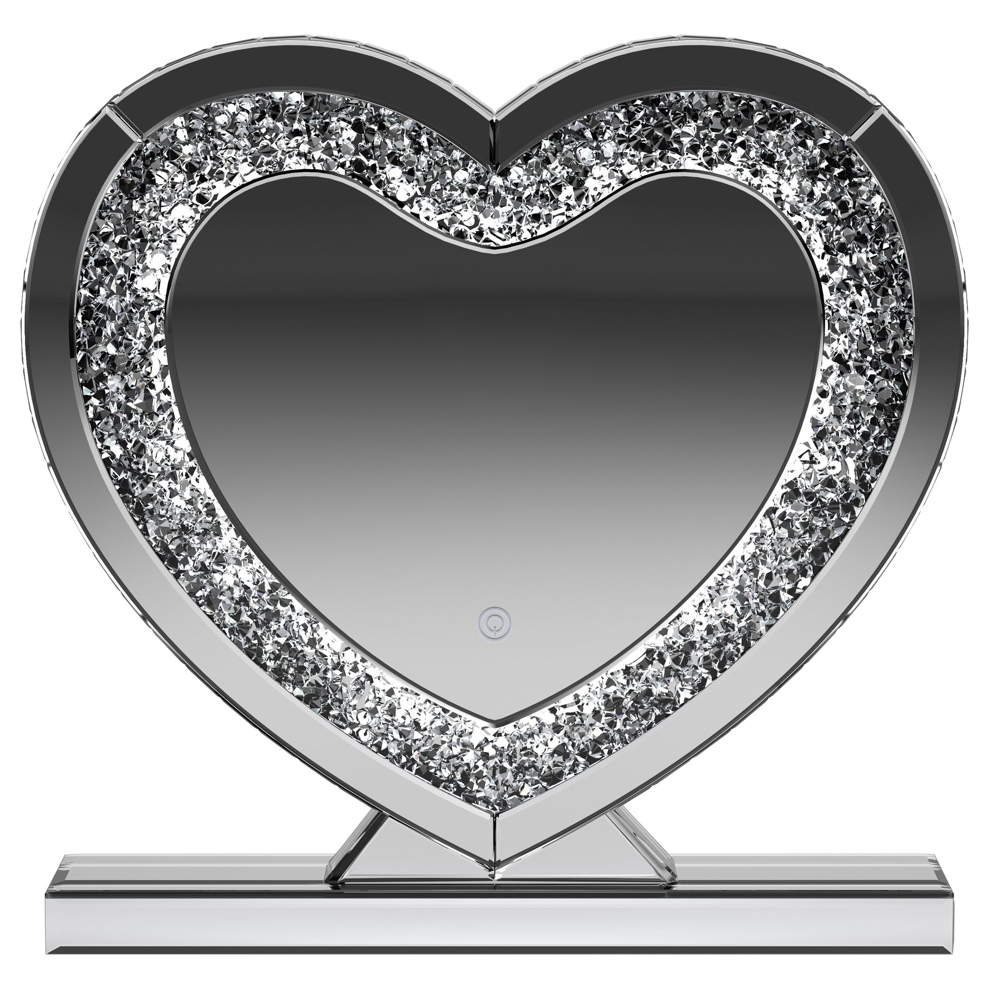 This heart-shaped table mirror blends glam style with practical lighting, perfect for vanities or dressing areas. The mirrored frame features an inset of faceted acrylic crystal inlay that catches light beautifully, while integrated LED illumination adds clarity for grooming or makeup application. Its freestanding design and decorative shape make it as functional as it is eye-catching, ideal for bedroom surfaces or beauty stations.