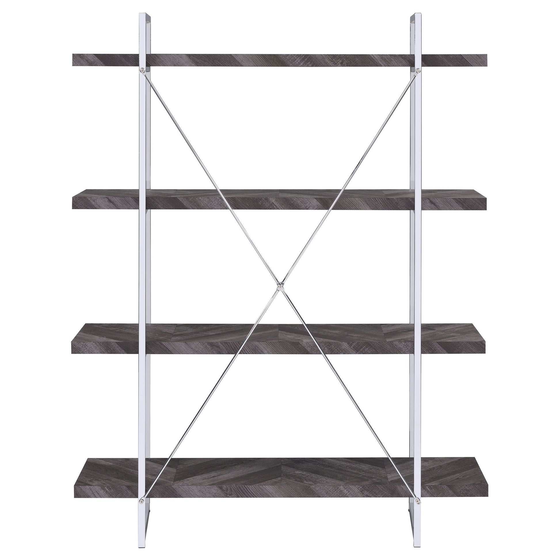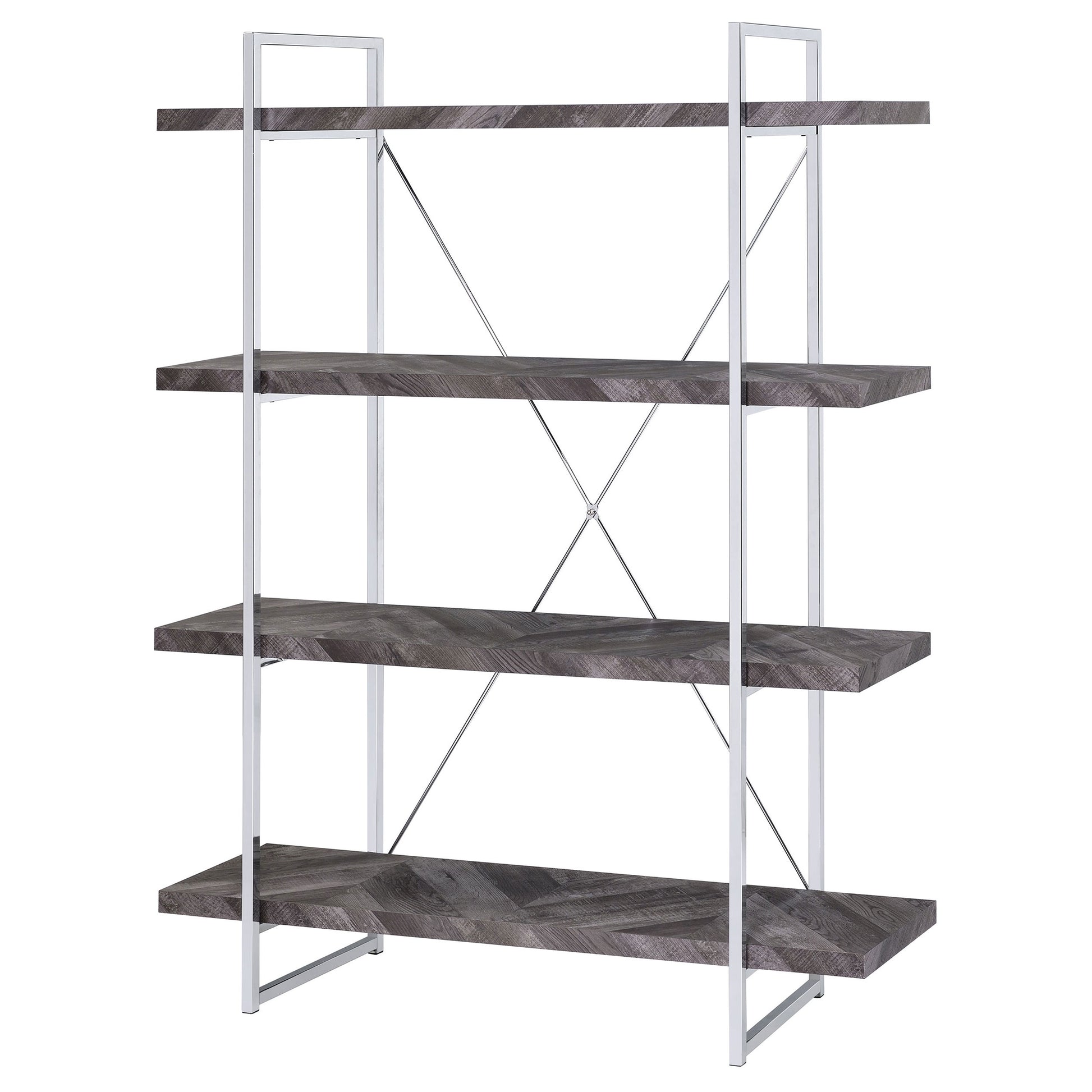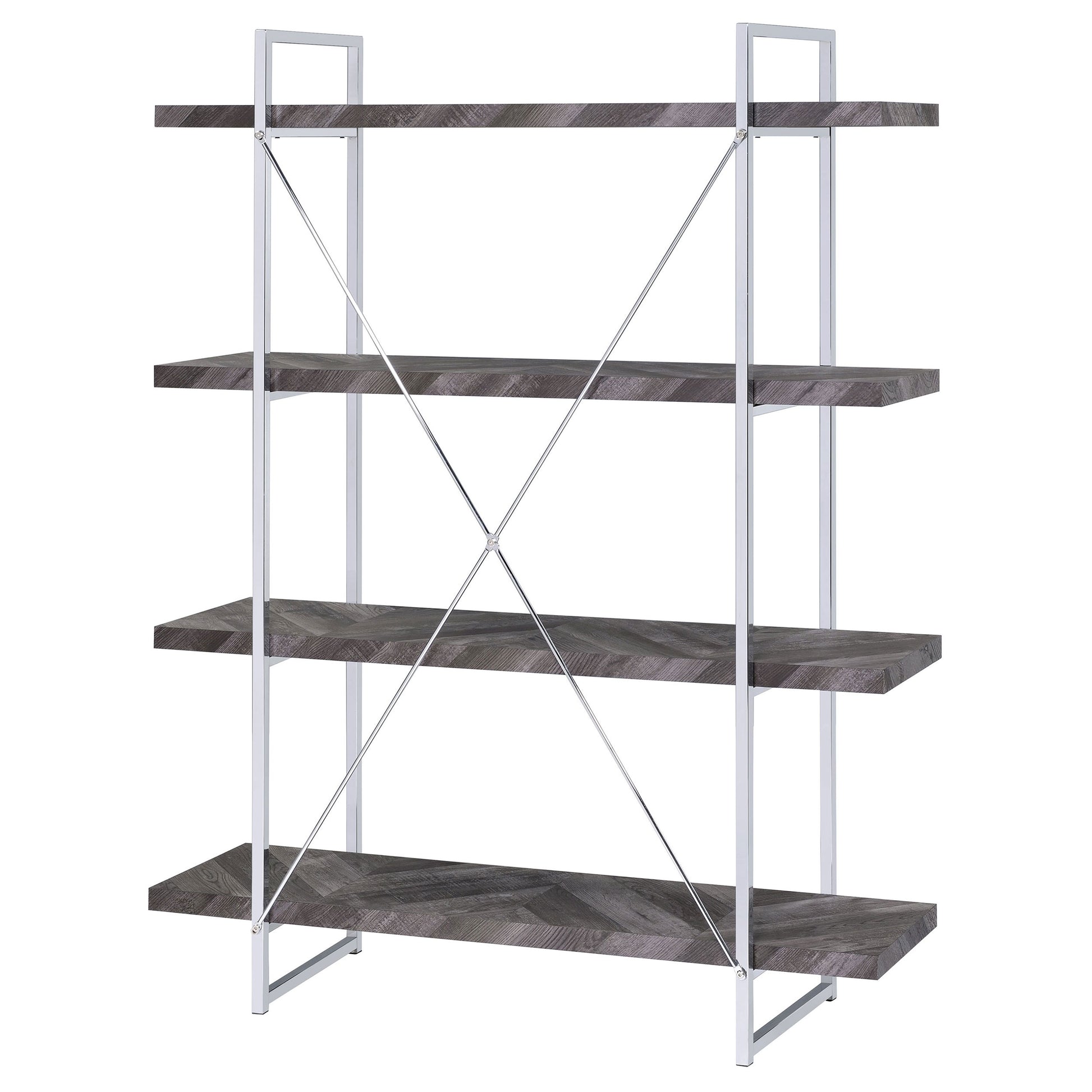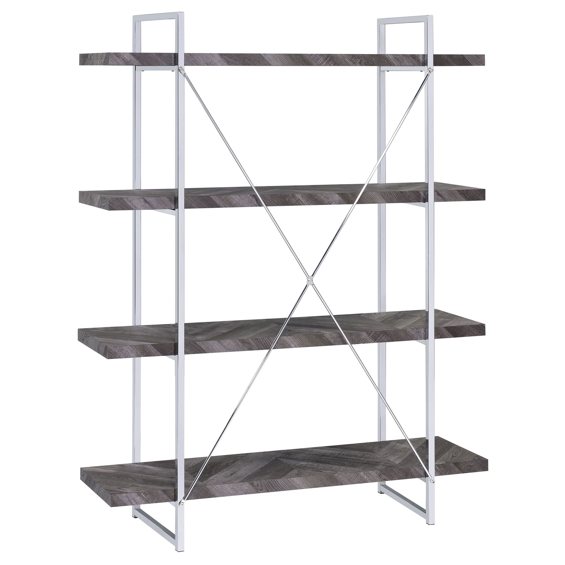 Enhance your storage and display space with this contemporary bookshelf, featuring a rustic grey herringbone finish for a modern organic touch. The sleek chrome metal frame provides durability and style, complemented by an X-shaped back support for stability. Four open shelves extend beyond the frame, creating a bold, geometric aesthetic perfect for showcasing books, décor, or collectibles. Crafted from engineered wood and metal, this shelving unit blends industrial and modern styles seamlessly, making it a stunning addition to living rooms, offices, or bedrooms.