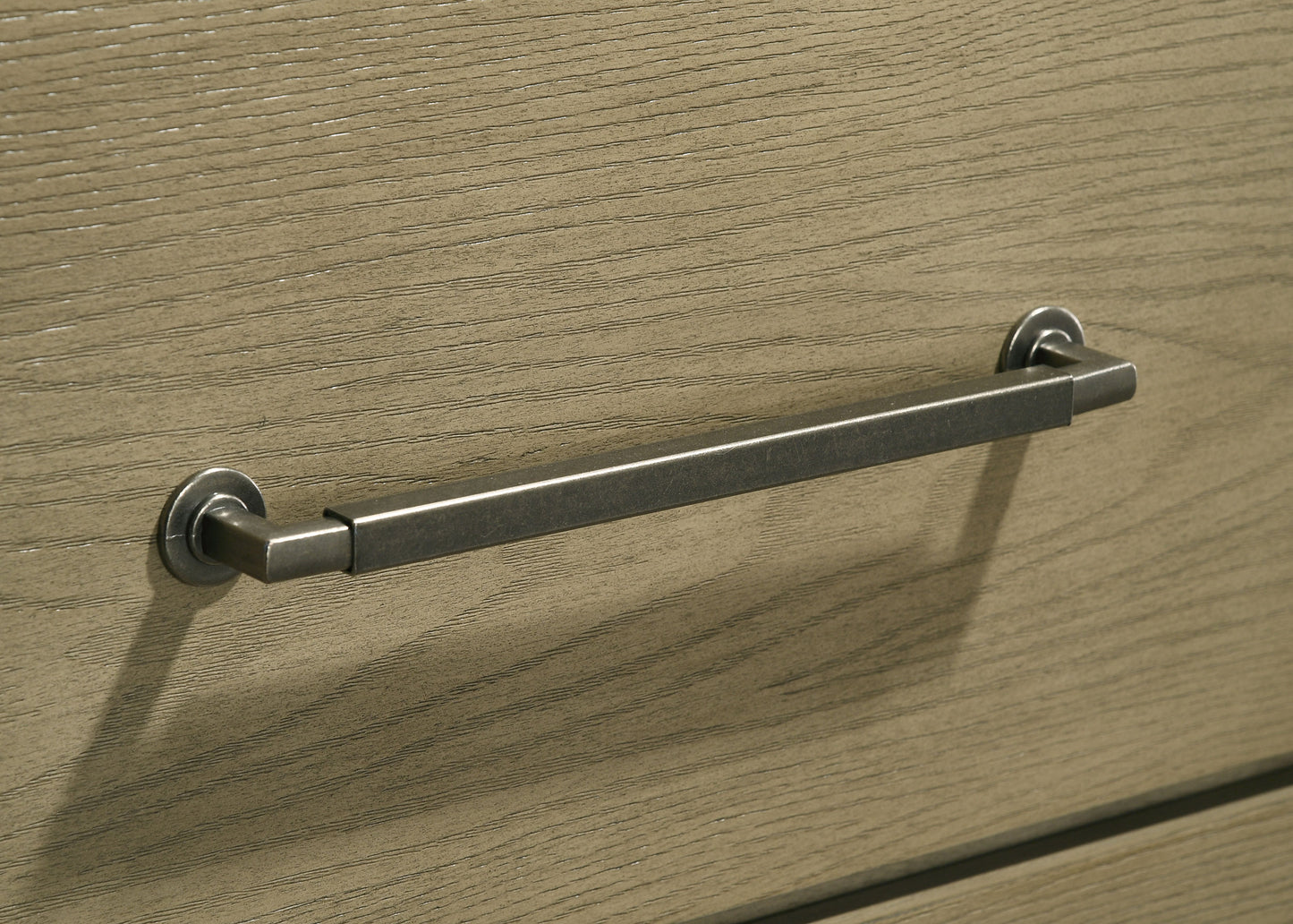 • Antique nickel metal knob and pull handles add contrast and a refined traditional touch