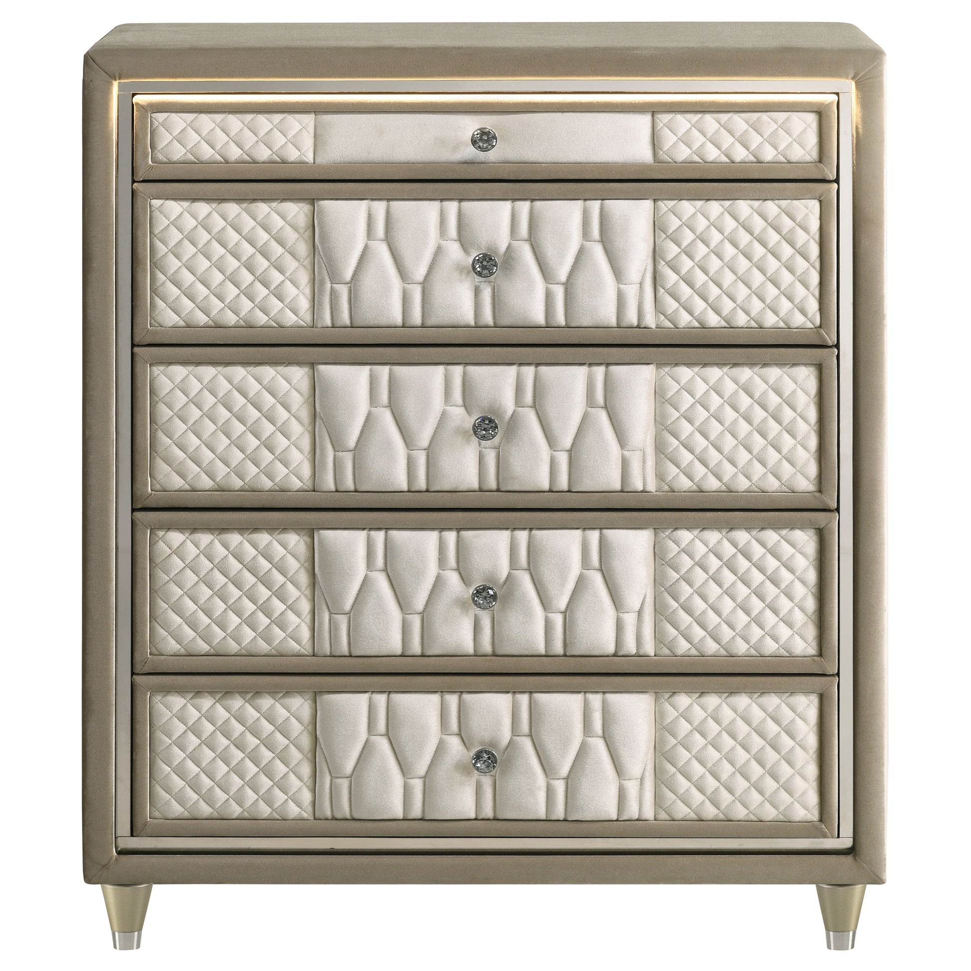 Embrace elegance in full velvet with this five-drawer chest, where ambient lighting meets refined craftsmanship. Upholstered in a harmonious mix of ivory and camel velvet, each drawer is adorned with quilted textures, reflective acrylic accents, and crystal knobs for a soft yet glamorous presence. Integrated LED lighting casts a warm glow, while the brown felt-lined top drawer, English dovetails, tempered glass top, and heavy-duty glides elevate everyday function. Supported by clear acrylic legs, this chest blends softness with luminous charm.