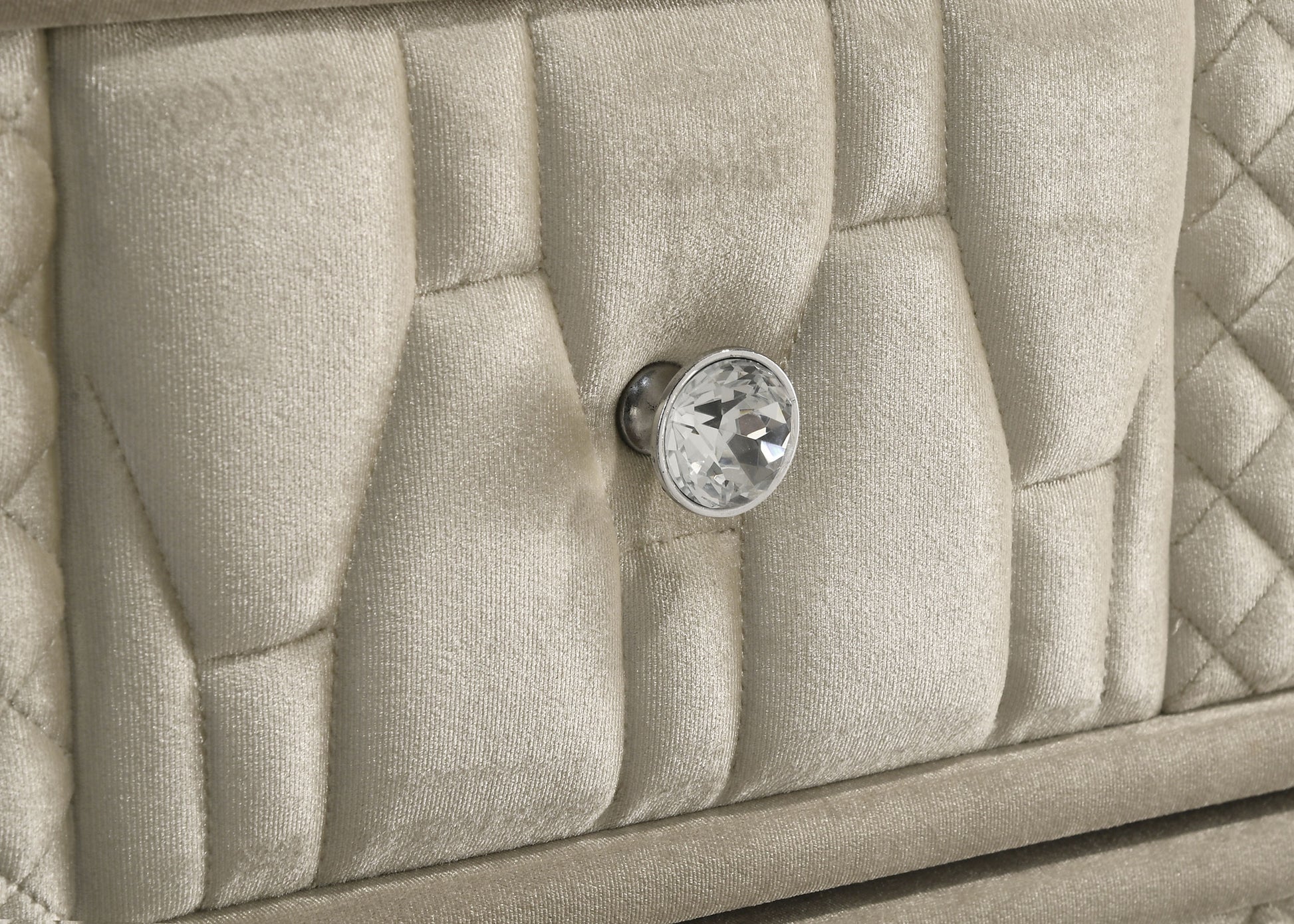 Warmth meets radiance in this dresser and mirror set, where ivory and camel velvet surround every surface. A built-in flame visualizer sits beneath a clear tempered glass top, with LED case lighting adding atmosphere. The tri-panel mirror features LED illumination to complete the glow. Finished with crystal knobs, quilted velvet fronts, and felt-lined drawers, this set pairs soft elegance with practical brilliance, all lifted by acrylic legs.
