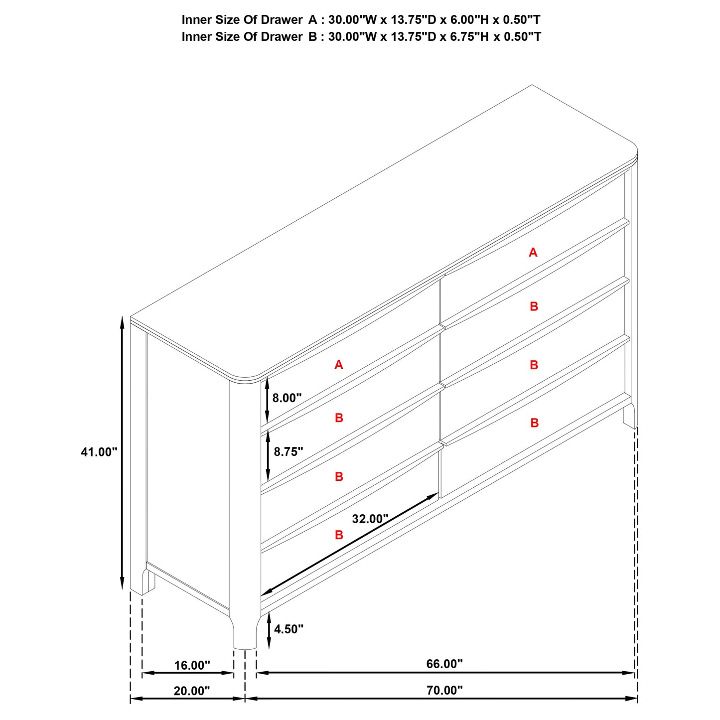 • Enhance your bedroom with the handsome profile and storage of a transitional eight-drawer dresser