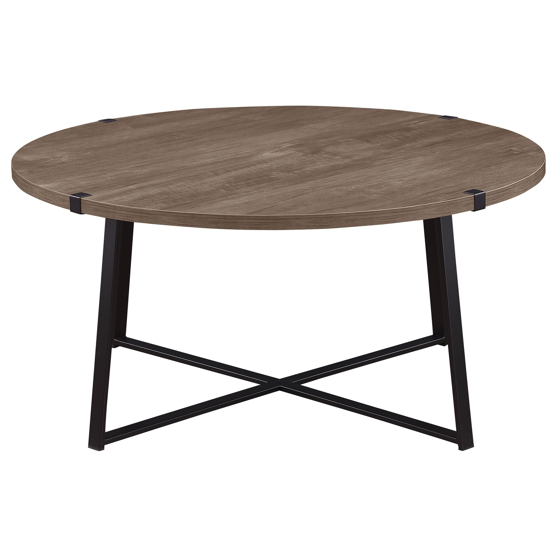 Augment an inviting living space with the stylish look of a modern round coffee table. The table pairs a light brown engineered wood top with a realistic wood grain texture, creating a sense of warmth. The sturdy metal base features a black powder-coated finish and intersecting lines, offering a sleek and stable foundation. Bracket accents add subtle industrial charm to the design. A scratch-resistant laminate veneer ensures long-lasting durability and effortless maintenance, making it a practical addition to any home.