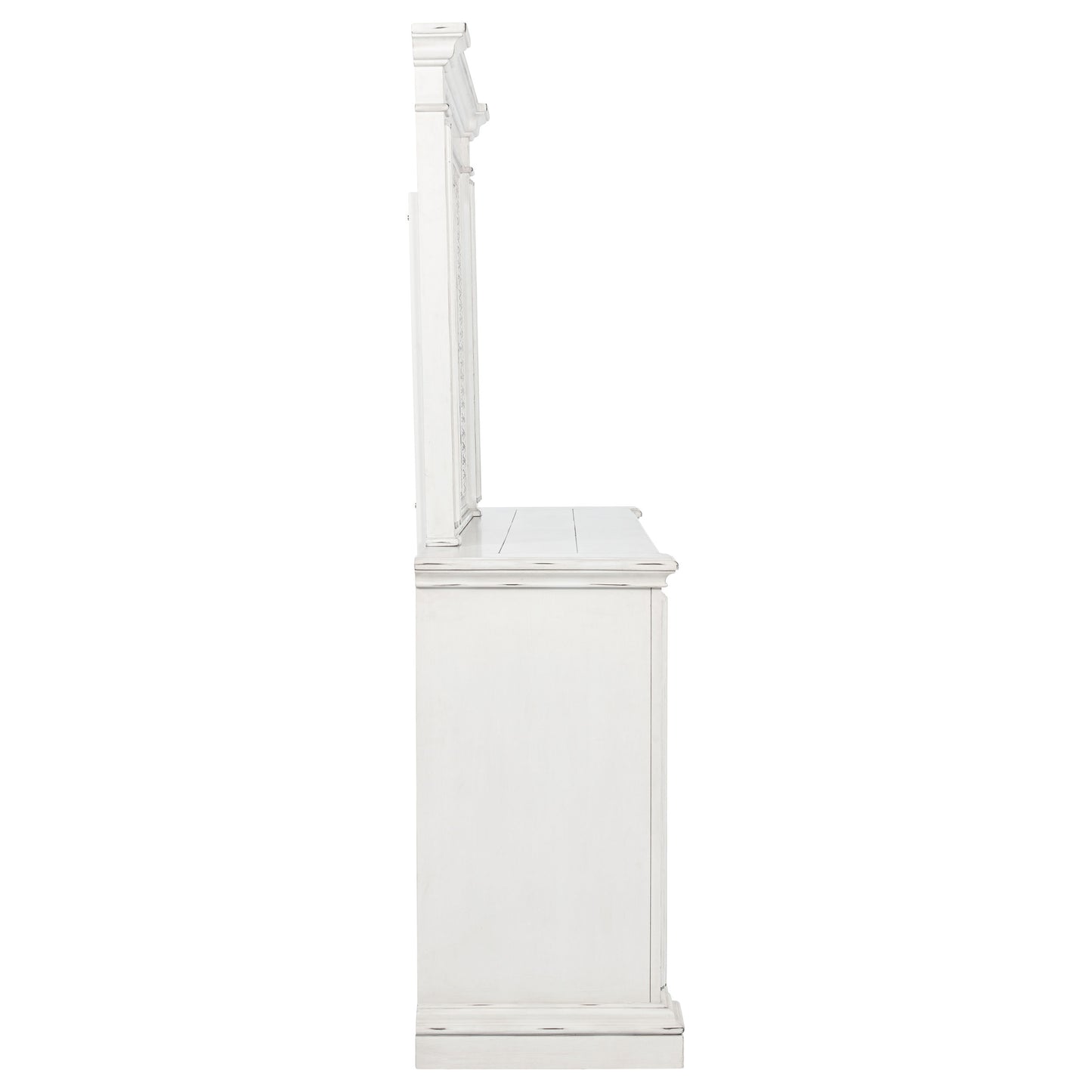 Rooted in traditional elegance, this dresser and mirror set brings vintage charm and refined detail to the bedroom. Framed with ornate carvings and softened by a distressed white finish, the six-drawer dresser offers ample storage with thoughtful touches—including a hidden jewelry tray in the bottom drawer. Antique bronze pulls and crown molding complete the look. Crafted from poplar and engineered wood, it’s designed with both beauty and function in mind.