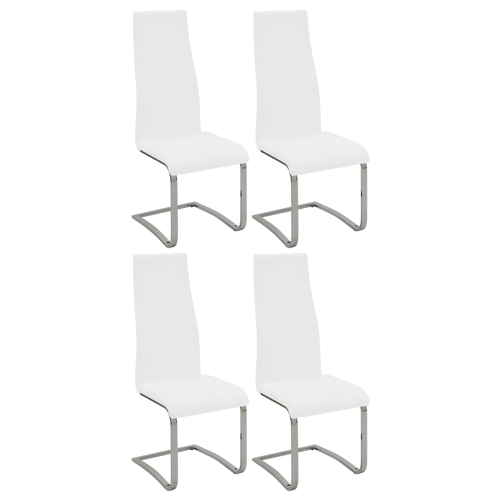 Sleek and sophisticated, this high-back side chair features a modern silhouette wrapped in crisp white leatherette. The ergonomic design provides excellent back support, while the armless, cantilever base offers a floating effect with retro flair. A polished chrome frame enhances the contemporary feel, making it an ideal complement to glass or high-gloss dining tables in modern interiors.