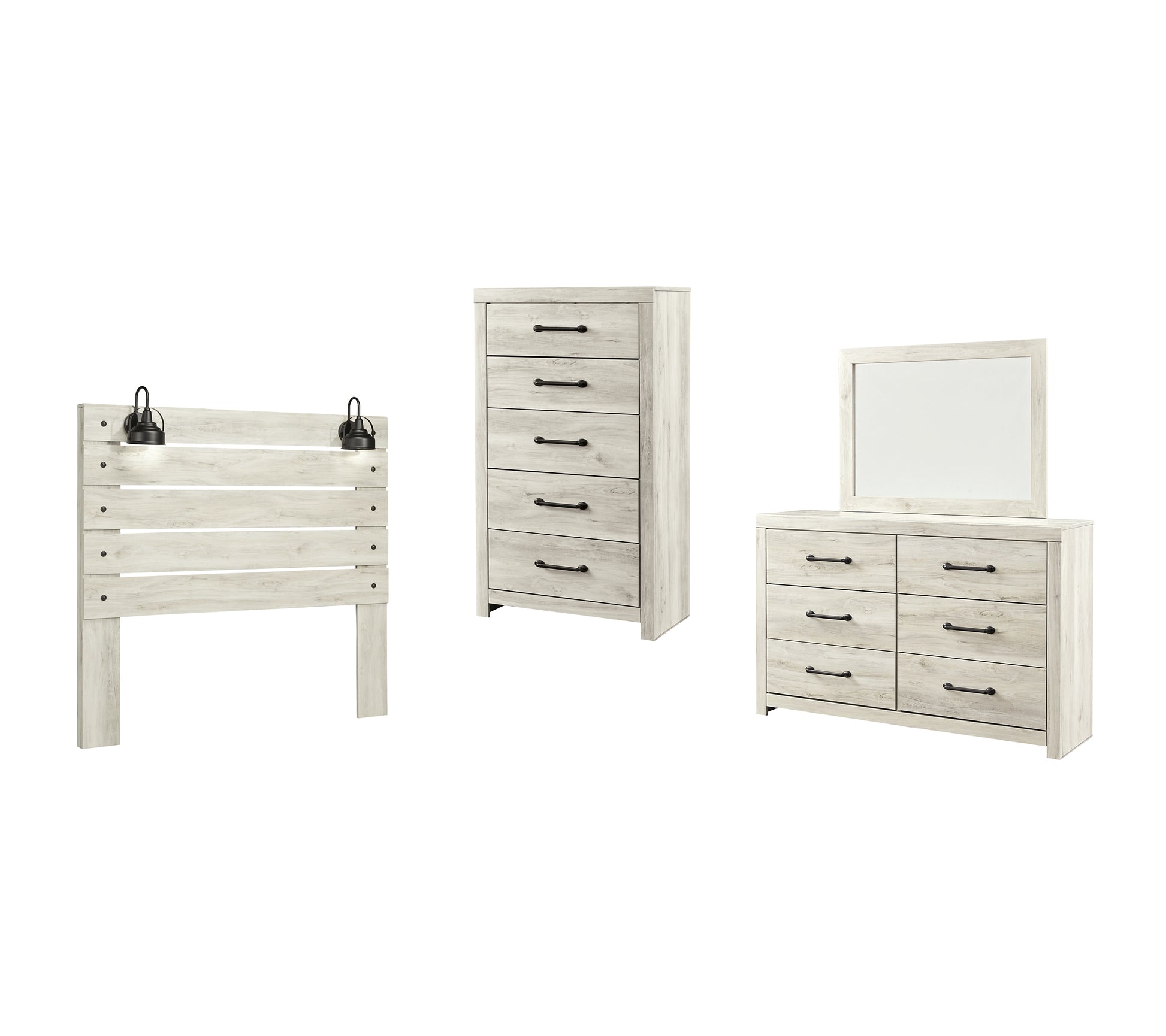 Details | B192-57: Made of engineered wood (MDF/particleboard) and decorative laminate, Wispy white finish over replicated oak grain with authentic touch, 2 decorative sconce lights, LED with 3 AA batteries, 2 slim-profile USB charging stations, Power cord included; UL Listed, Hardware not included, ¼" bolts are needed to attach headboard to existing bed frame, Bolt length depends on thickness of your bed frame, Assembly required, B192-46: Made of engineered wood (MDF/particleboard) and decorative laminate, Wispy white finish over replicated oak grain with authentic touch, Large-scale hardware with dark finish, 5 smooth-gliding drawers, Drawer interiors are lined with a faux linen laminate for a clean, finished look, Safety is a top priority, clothing storage units are designed to meet the most current standard for stability, ASTM F 2057 (ASTM International), Drawers extend out to accommodate maximum access to drawer interior while maintaining safety, B192B1: Includes dresser with mirror, Made of engineered wood (MDF/particleboard) and decorative laminate, Wispy white finish over replicated oak grain with authentic touch, 6 smooth-gliding drawers, Drawer interiors are lined with a faux linen laminate for a clean, finished look, Large-scale hardware with dark finish, Mirror attaches to back of dresser, Assembly required, | |