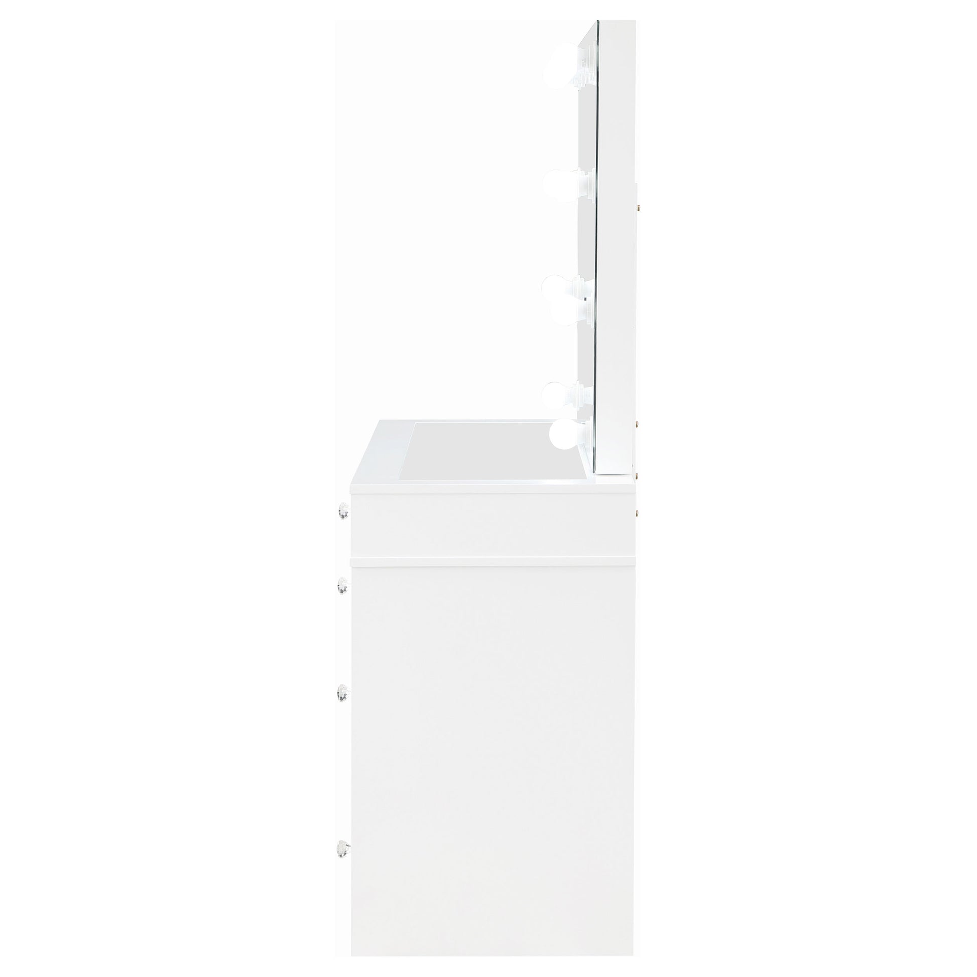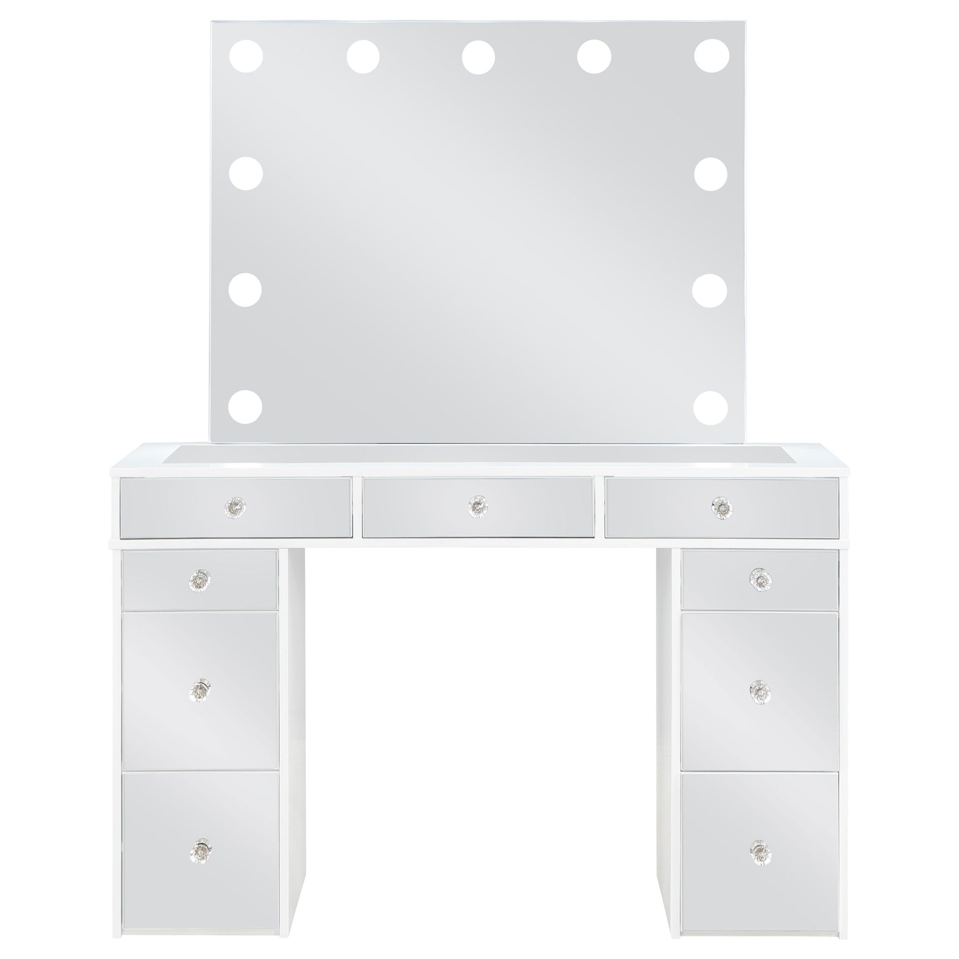 Pull out all the stops to set up a stylish and functional space for your makeup and prep, adding this three-piece white finish vanity set to a modern bedroom. Wood products construction with mirrored drawer fronts and a gray upholstered stool cushion team up to maintain an easy palette with versatility. Find space in nine drawers to stash implements, cosmetics, and accessories. Charming crystal knobs and a felt-lined top drawer add to a list of fab features. The marquee element of this set is a mirror surrounded with bulbs to offer helpful lighting as it enhances a chic design.