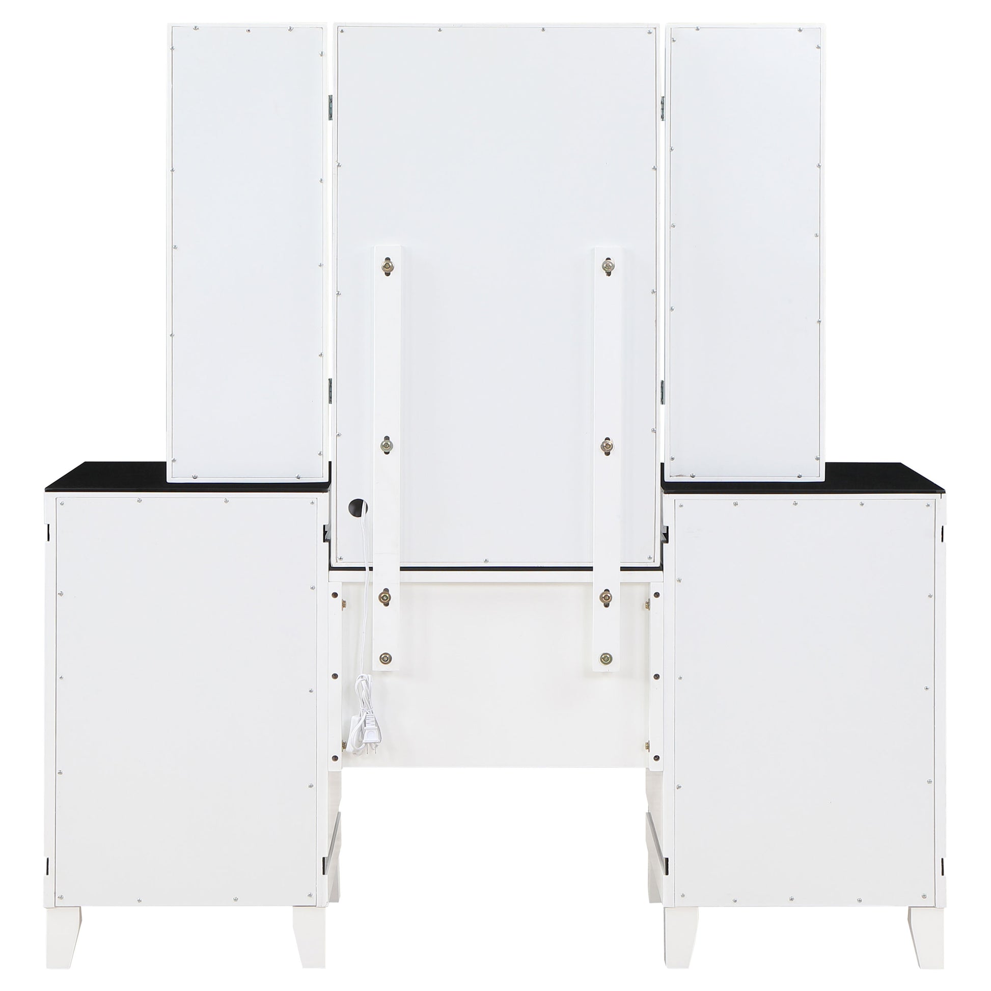 Take modern glam to new heights with the bold contrast and sophistication of this contemporary vanity desk. With six roomy drawers for easy storage, including a felt-lined top drawer for delicates, the large desk features a bold black and white finish sure to stand out within your bedroom or dressing area. A tri-panel mirror equipped with 14 lights, delivering the bright illumination you need for applying makeup and styling hair. The clean-lined design is complemented with crystal-like knobs that glimmer in the light, and tapered legs that offer excellent support and stability. The vanity is complete with full extension metal glides for seamless performance as you prep for everything from a day in the office to a night out on the town.