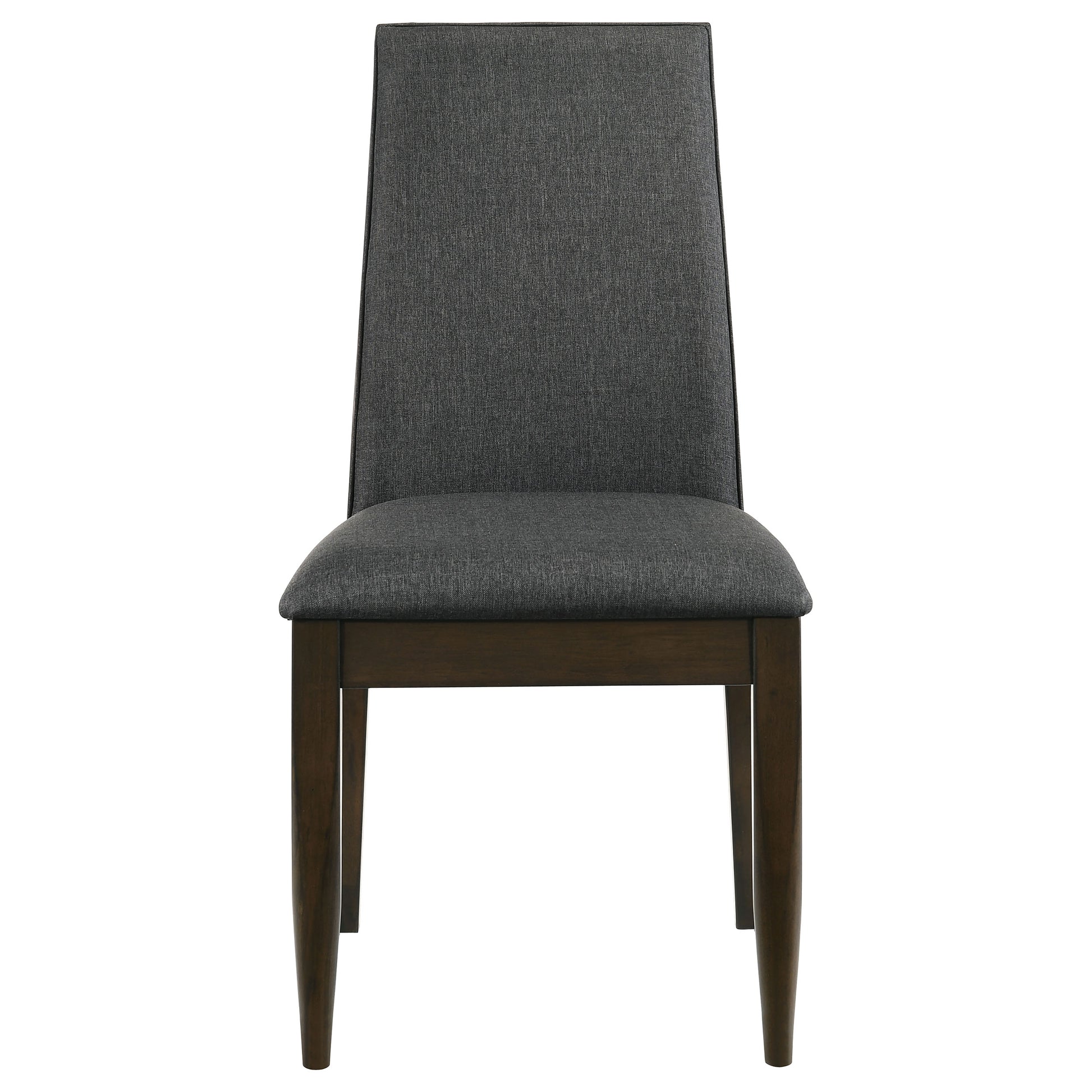 Bring a set of these beautiful contemporary side chairs to your dining table for a sophisticated touch. Designed with elegantly sloped backrests, each dining chair offers an inviting, slender silhouette for restful dining experiences. Across their frames, a dark walnut finish brings a depth of color and richness. Tapered square legs carry the modern touches. Lastly, soft grey fabric padding across the seat and contoured backrest create a comfy resting place.