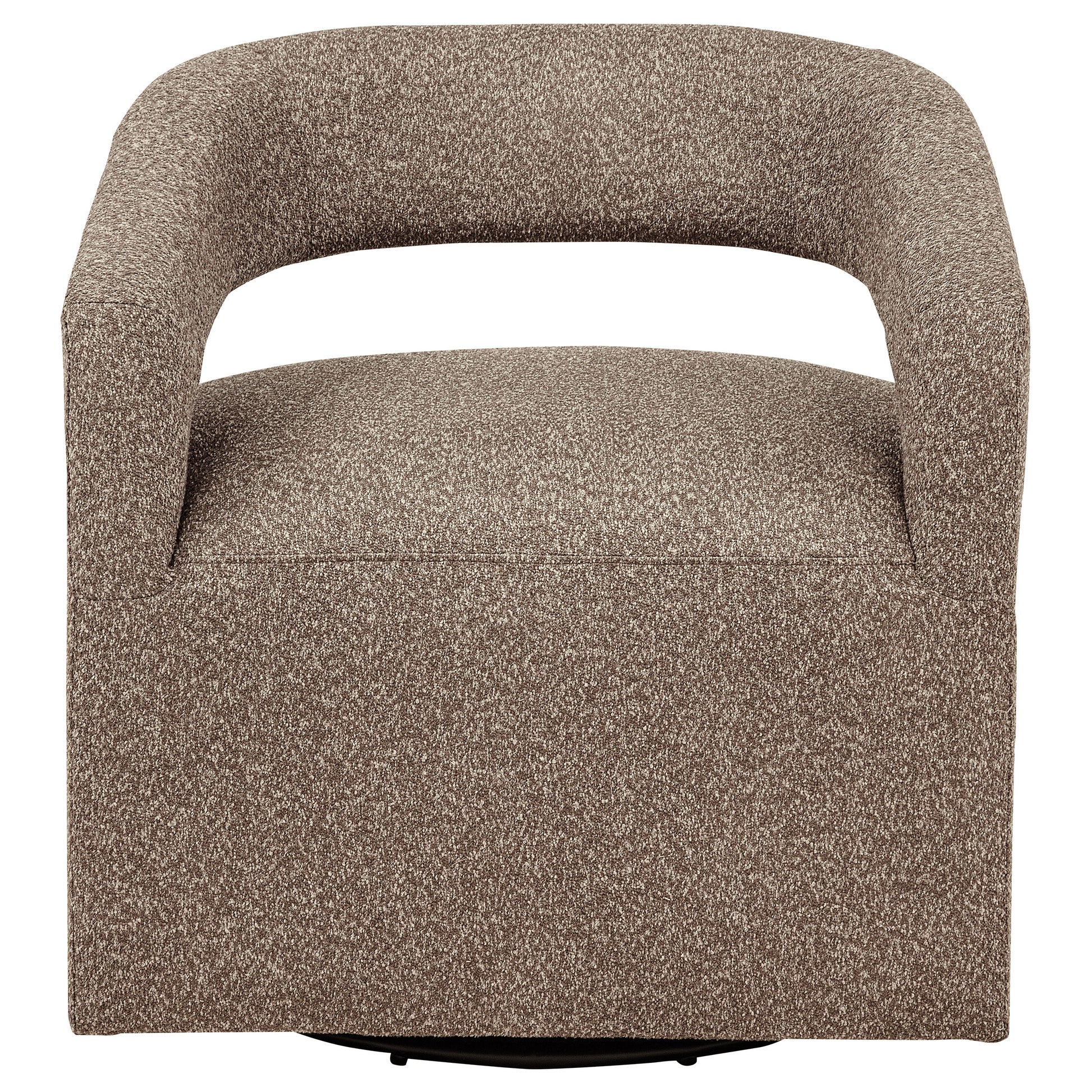 Curved form meets effortless movement in this modern swivel accent chair. With a rounded open back and tailored seat, it delivers sculptural balance and all-around comfort. Upholstered in textured boucle and built on a hidden swivel base, it glides smoothly to support dynamic living. Its compact footprint and graceful silhouette make it ideal for layering into lounge corners, reading nooks, or open floor plans seeking softness and versatility.